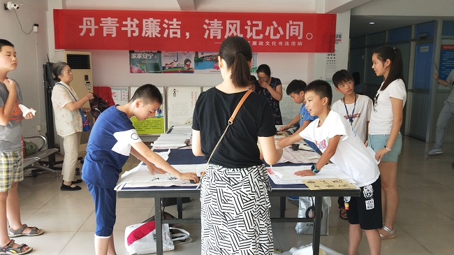 “廉可生正气,洁能显高尚;万事防为先,防患于未然。”为加强社区廉政文化建设,充分发挥社区在传播廉政文化中的基础性作用,不断扩大廉政文化的影响力和覆盖面,增强居民反腐倡廉的积极性,提高居民的参与度。盘龙社区团支部与街道监察审计室强强联合,于2018年8月10日开展了一场以“丹青书廉洁,清风记心间”为主题的廉政文化书法活动。 活动中,社区邀请了10名书法小志愿者在社区大厅现场书写各类廉政小标语。借书写廉政标语的契机,将廉政文化输入到青少年的生活中,廉政文化从小学起,从小就培养起廉洁自律的意识。短短一个小时,书法小志愿者们挥毫泼墨,很快,几十副书画作品就产生了,洋洋洒洒地铺陈开来,共同叙述着以廉为美、以廉为乐、以廉为荣的主题。 本次活动以书法为载体传播正能量,把积极向上的廉政文化用书法表现出来,拓展了反腐倡廉教育的内容和形式,进一步加大了社区从源头上预防和治理腐败力度。