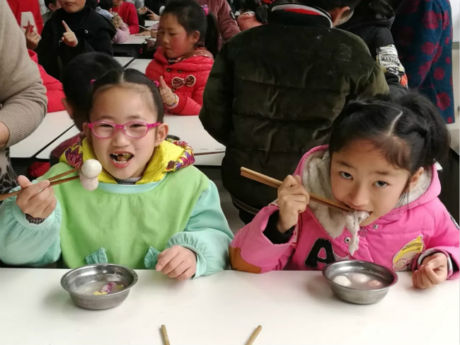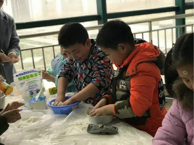 二年级师生和部分家长,齐聚食堂,开展了搓汤圆体验活动。活动现场,热闹非凡。只见家长们挽起袖子,揉面团、搓元宵、放馅料、捏造型。一双双巧手的搓转,一个个圆圆乎乎的汤圆就出现在大家眼前。小朋友们迫不及待地拿起了已经揉好的面团,模仿着家门们做汤圆的步骤,认真地做着自己的汤圆。“你先揉个圆圈,再捏扁,加入馅,再捏起来……”小朋友们创意无限,不仅学得有模有样,而且还独具特色。