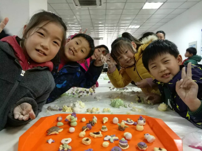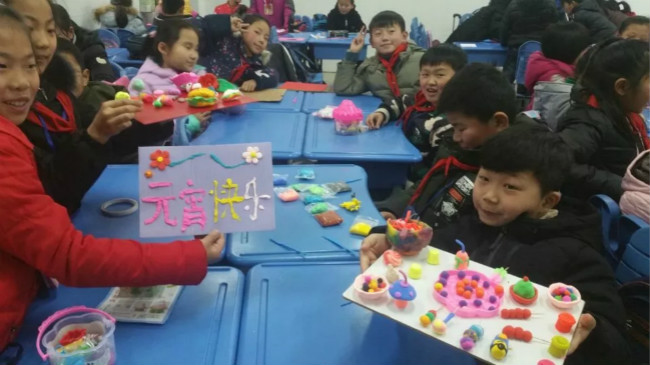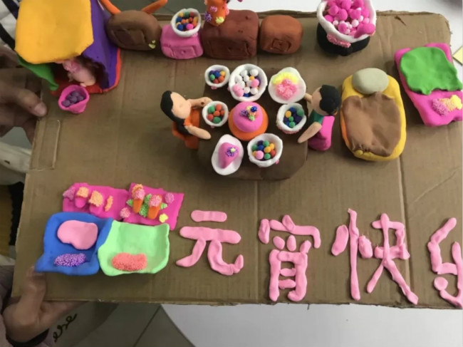 中午醇香甜糯的酒酿元宵还在唇齿间回味,下午,四年级的紫藤娃们就用超轻黏土和米粉为我们奉上了元宵节盛宴。同学们纷纷和自己的伙伴进行合作。一双小手,揉揉捏捏,搓搓扭扭,五颜六色的黏土在孩子们的手中变幻出各种生动有趣的造型。瞧,有的同学正在捏吃元宵的场景,一家三口围坐桌边,一碗碗五彩精巧的小元宵,一道道栩栩如生的美味菜肴,看了就让人垂涎欲滴。