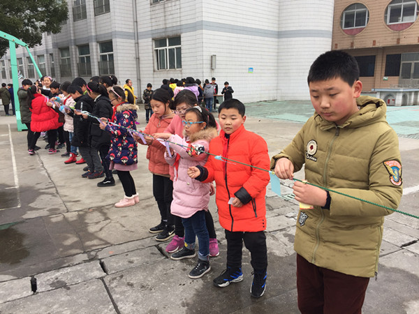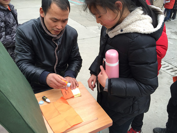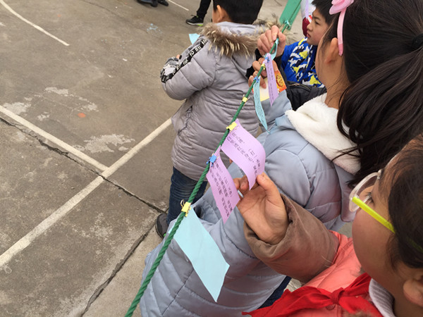 接下来的正月十四和正月十五的中午时分,在部分班级的辛勤布置下,不一会的功夫,整个活动场地变得五彩缤纷,四周悬挂着的800多条谜语竞相争辉,让人眼花缭乱,呈现出一片温暖祥和、活泼雅致的欢乐景象。这些谜面科学而通俗,有猜字的、有猜成语的、有地名的、有交通工具的等等,他们集趣味性与知识性于一体,让大家在乐中学,共同领略祖国语言文字的无穷魅力。当然,本次活动还设置了一至三等奖,并准备了各色奖品,极大激发了所有队员的兴趣。 正月十四和正月十五的下午第一节课后,三四年级和五六年级的队员分批次进入会场,开始活动。顿时,整个会场沸腾起来了。队员们穿梭其间,流连忘返,构成了一道独特的风景线。谜面前,一双双欣喜激动地眼睛闪烁着智慧的光芒。他们兴致高涨,有的三五成群,结伴猜谜;有的冥思苦想,抓耳挠腮;有的正和同伴认真探讨……大家或驻足凝神,或喃喃自语,或热烈讨论,或欢呼雀跃,不时会传来阵阵笑声而奔向兑奖台。老师们也都积极参加了这次活动,有敲章的,有维持秩序的,有夹回提醒的,校园内呈现出一片其乐融融的景象,浓浓的年味在校园里飘荡。