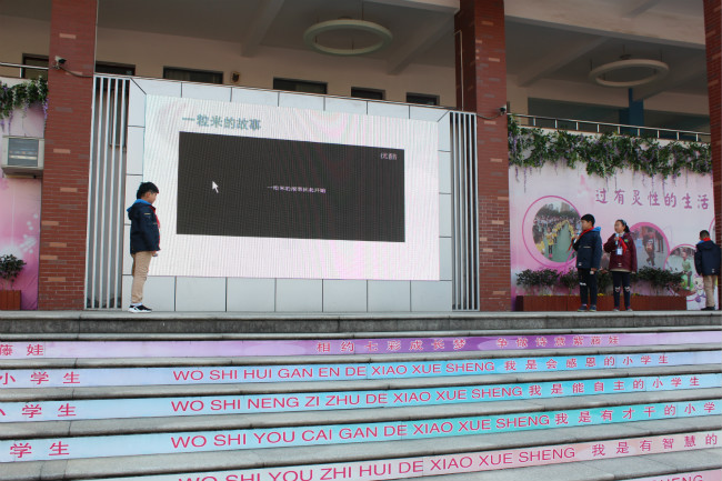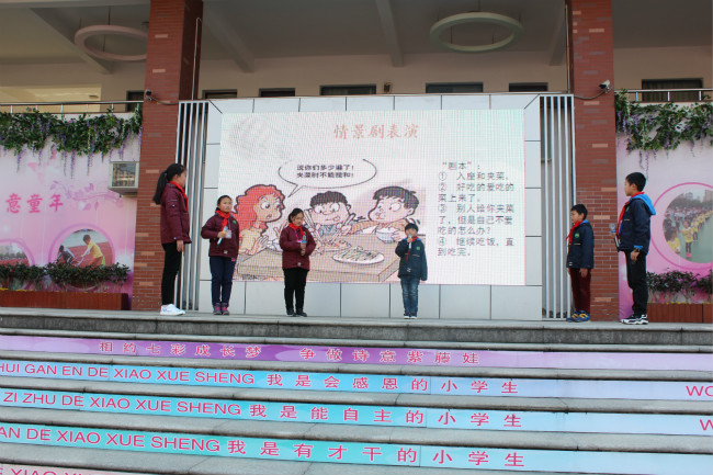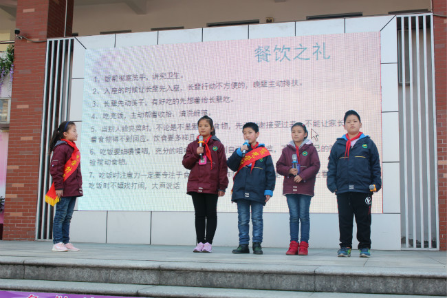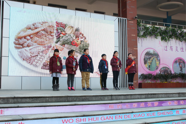 早春三月,草长莺飞,冬天的寒意还未褪尽,春天就带着绿色的气息已经向我们走来。新桥实验小学生命教育月启动仪式也在一片生机中拉开了帷幕,本次生命教育月活动主题是:在食育中提升品格。从小到大,一日三餐,吃饭,是一件再平常不过的事。可是队员们对知道吃饭的学问又知道多少呢?餐桌上的礼仪又有哪些?情景剧表演《餐桌上的礼仪》揭晓了答案。队员们倡议当我们拿起筷子的时候,当我们与长辈、朋友共餐的时候,当我们离开餐桌之前,让我们用自己的行为感染身边的每一个人,让更多的人知礼懂礼餐桌礼仪的本质其实是尊重,不仅是对人的尊重,也是对食物的尊重。接下来队员们展示了食堂餐桌上的剩饭剩菜图片,就图片感慨:看到这么多食物被浪费,真是令人心痛呀!古人云“半丝半缕恒念物力维艰,一粥一饭当思来之不易”,通过欣赏视频 “一粒米的故事”让队员们感受到从竹篮里到嘴里,一粒米来的是那么的不容易。其实不只是一粒米,许许多多的食物都是他们用整整的一生来赴约,如果大家漫不经心毫无感觉地就把它们打发了,它们该是多么的伤心呀?一粒米的背后有农民伯伯辛苦的劳动,一顿饭的背后更有父母长辈的辛劳付出。四(2)中队柏威和朱一铭体验了为父母做一顿晚饭。他们现场谈了自己做饭的感受。倡议全体队员们珍惜每一粒粮食,拒绝浪费。感恩食物背后每个人的付出。环保观察员通过发现午餐餐盘里最后剩下的都是青菜,发起营养吃起来的活动倡议,合理的营养搭配有助于健康, 这些营养对于身体来说缺一不可,它们富含在各种食物中,不挑食不偏食,健康身体从吃开始。饮食关系着每个人的身体健康,饮食与劳动更是密不可分,学校建立了小绿人农场,春耕秋收,五年级各中队代表分享他们观察菜的生长过程,结合数学、科学知识对蔬菜等植物的生长过程进行管理,以确保它们能像少先队员们一样健康、快乐地生长。希望有一天午餐就能吃到他们亲手种植的蔬菜。多一份绿色,生活也将多一份美好!最后辅导员沈老师对整个生命月活动做了部署,并且倡议同学们在植树节之际,从关心校园绿化做起,不践踏草地,不攀折树枝,让绿色点缀我们的生活,让绿色点亮我们的生命。
