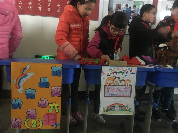 学雷锋活动随着三月徐徐的春风吹进罗溪中心小学,吹进全体辅导员和队员们的心田。在少先队大队部的精心组织下,3月20日该校开展了“手拉手爱心义卖,心连心一起成长”学雷锋爱心义卖活动。 队员们将自己平时节省下来的文具用品、闲置的书籍和作业本、超龄玩具整理出来,标明了价格,整整齐齐地摆放在摊位上,还有现做的水果沙拉、冰激凌蛋糕、蛋挞等,整个文化长廊俨然成了一个大型“超市”,“小老板”们都跃跃欲试,等待“小顾客”们的光临和挑选。“走过,路过,不要错过……”“甩卖啊,甩卖……”叫卖声此起彼伏。为了说服别人购买自己的商品,队员们使出浑身解数,妙招频出。“打折出售”、“买一赠一”……,还有的干脆拿着东西向熟悉的辅导员和同伴推销。“小顾客”们也没闲着,他们在叫卖声的吸引下,来回不停地穿行,一会儿在那讨价还价,一会儿跟队员介绍自己买的宝贝。活动结束后,很多队员还意犹未尽,在辅导员们的催促下才依依不舍地“收摊”回家。 义卖活动所得善款将由大队部收集公示后,捐给该校的贫困学生,完成他们的微心愿。活动的圆满举行将学校“学雷锋月”活动推向纵深,队员在奉献爱心的同时也获得了成长。 (撰稿:杨继芬摄影:谢红琴审核:卢庆平)
