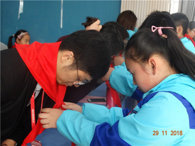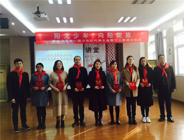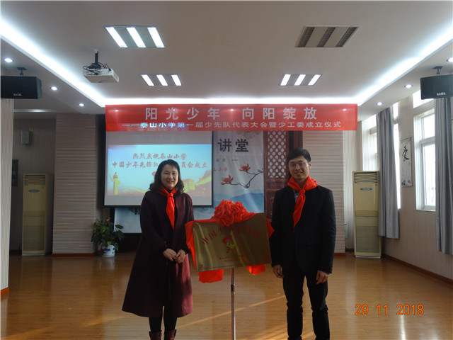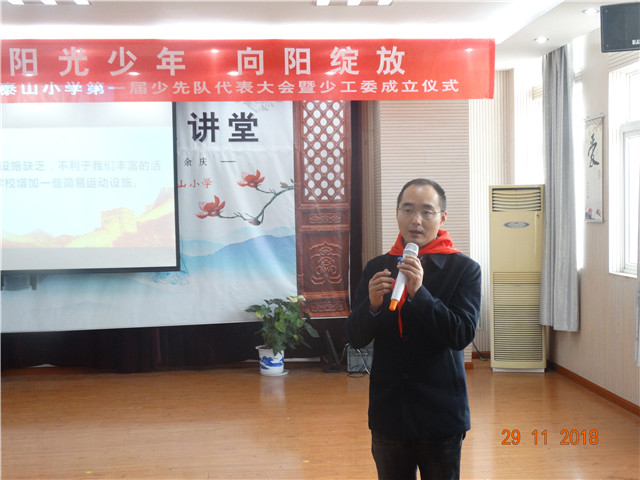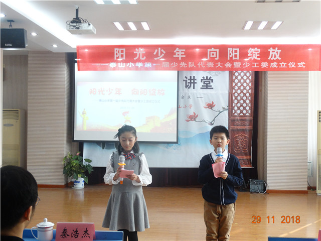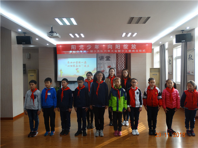 11月29日下午,在激昂的《红领巾飘起来》旋律中,泰山小学第一届少先队代表大会暨少工委成立仪式在泰山小学多媒体教室拉开了序幕。