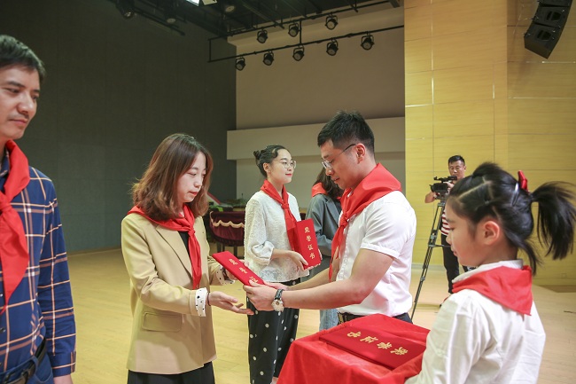 前期,新北团区委、区少工委组织开展了“诵读学传 礼赞新时代”新北红领巾寻访案例的评选,最终产生了“十佳”案例和十个“优秀”案例。活动现场,区教育局副局长、文化体育和旅游局局长杨杰与团区委书记秦浩杰一起为获得 “诵读学传 礼赞新时代”新北红领巾寻访“十佳”案例奖项的辅导员们颁奖。