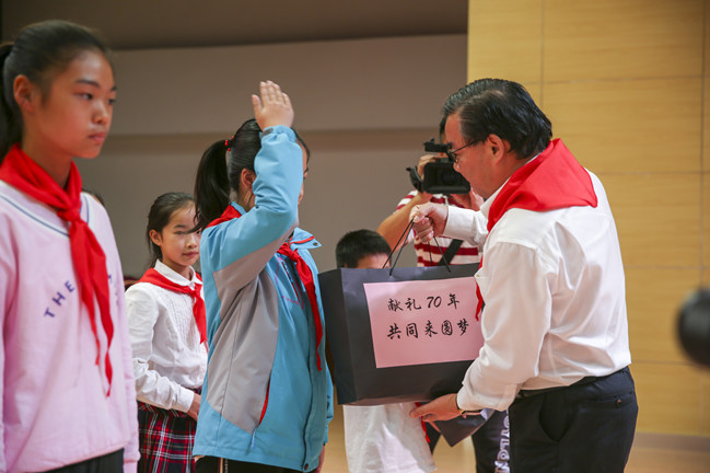 为庆祝人民政协成立70周年和少先队建队70周年,发挥委员爱心基金扶危济困的积极作用,10月12日下午,新北区政协、共青团新北区委员会和新北区少工委共同举办“不忘初心、牢记使命”新北区政协委员爱心基金圆梦助学活动暨新北少先队品牌导图发布仪式。 江苏省少工委副主任徐美华,区政协党组书记、主席薛建南,区管委会副主任完利梅,常州团市委学少部部长、市少先队总辅导员张莉以及区政协、区教育局、团区委、区少工委的相关领导出席了本次活动。区政协机关党员干部、各界别小组负责人、各镇(街道)政协工委联络员和团组织负责人、各校分管校长和大队辅导员、部分政协委员代表和教师、少先队员代表共约150人参加了此次活动。 此次活动既是新北政协和少先队组织对少年儿童成长的关爱,更是对新中国成立70周年的献礼,活动在《逐梦中国娃》的少先队员舞蹈表演中拉开帷幕,区政协党组副书记、副主席杨光为活动送上祝福。 进一步发挥区政协委员爱心基金的积极作用,关爱帮助并激励家庭困难中小学生积极进取、立志成才,此次区政协联合团区委、区少工委共同开展了区政协委员爱心基金圆梦助学活动。在区教育局的大力支持下,共收集到来自全区200个家庭生活困难但品学兼优的中小学生微心愿,区政协委员爱心基金出资10万元,助力他们圆梦。区政协党组书记、主席薛建南现场为受助学生代表们送上他们期待已久的“微心愿”礼物。