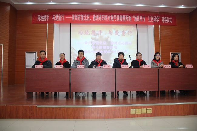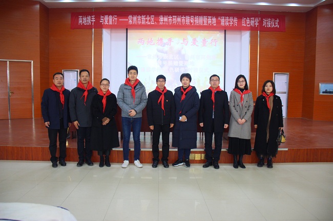 11月26日,常州市新北区、徐州市邳州市鼓号捐赠暨两地“诵读学传•红色研学”对接仪式在徐州市八义集镇中心小学举行。省少工委副主任徐美华、邳州市教育局副局长杜欣、共青团邳州市委书记李双、共青团常州市新北区委副书记陈俊玮、共青团邳州市委副书记张可莉、共青团常州市新北区少先队总辅导员秦琳、邳州市少工委负责人杜万云、江苏菲趣国际旅行社有限公司合伙人徐涛出席活动。