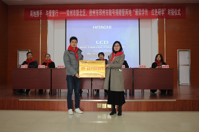 两地手拉手,红领巾更鲜艳。活动现场,八义集中心小学赵成军校长首先致辞,爱心企业江苏菲趣国际旅行社有限公司为学校提供了一套两万余元的中型鼓号器材,在活动现场与学校举行了鼓号捐赠仪式。徐州市与新北区以传承红色基因为主线,依托两地红色研学实践,深入开展“诵读学传”活动,“邳州●新北少先队红色研学”对接仪式也隆重举行,陈俊玮和张可莉一同上台揭牌。