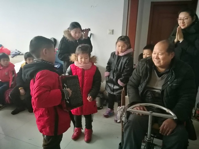 又是一年春节来到,盘龙社区小志愿者们又想起了结对帮扶对象轮椅叔叔——刘兆金。1月又恰巧是轮椅叔叔的生日,于是,2018年1月6日上午,盘龙社区与优派乐学亲子中心携手组织了10对亲子家庭前往轮椅叔叔家中为其度过了一个难忘的生日。 在刘兆金家,小志愿者们为老人送上生日蛋糕,大家一起为老人点亮生日蜡烛,齐唱生日歌曲并送上生日祝福, 刘兆金老人带着生日帽、品尝着香甜的蛋糕,望着一张张诚挚的小脸,开心得像个孩子。小小的屋子中充满了欢声笑语,场面十分温馨。刘兆金是社区一户失独家庭,长期以轮椅为代步工具,与年迈的父母生活在一起,但他并没有因此而意志消沉,反而越挫越勇,用坚强的意志做一些力所能及的事情维持自己的生计,这份坚毅让孩子们感动,孩子们愿意和轮椅叔叔在一起。 刘兆金老人感慨地表示,这是他过得最特别的一个生日,他没有儿女,但这些孩子就像他的孩子一样,牵挂着他,温暖着他。