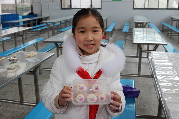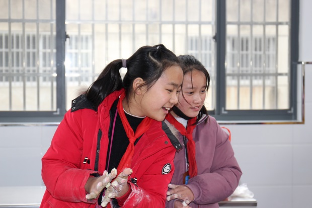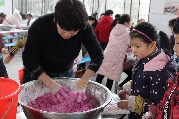 今天下午,两个班的学生齐聚学校食堂,揉面,撒水,搓团......同学们忙的不亦乐乎。为了精益求精,有些同学还互相请教如何让米粉保住水分、揉出韧性。好在老师的耐心指导和同学们的互相帮助,上千只不同色彩的元宵整齐地排列开来。初春的午后乍暖还寒,仍不免感觉丝丝凉意,但百小食堂内,100余名学生却热情似火。