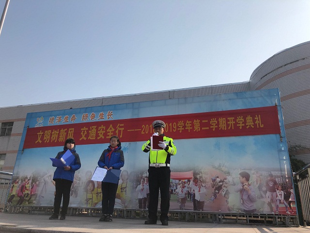 新春伊始,万象更新。2019年2月25日上午国英小学的操场上空歌声嘹亮,鲜艳的五星红旗冉冉升起,在庄严的升旗仪式中,国英小学全体师生以“文明树新风,交通安全行”为主题的春季开学典礼拉开了帷幕。 为进一步推进交通安全教育进校园,使全校学生牢固树立交通安全意识和文明礼貌出行意识,国英小学邀请新北区交警大队高峰警官来为少先队员们提出交通安全建议,高警官提醒学生三个关键点:首先,每天准时起床,放学路上不逗留;其次,上下学坐车注意安全;最后,过马路时注意安全。高警官发自内心的呼吁在场的所有少先队员们:“道路千万条,安全第一条。” 接着顾振林副校长对队员们提出新学期的寄语,衷心地送给全体同学三句话:1.一切重头再来。调整好作息时间,要有三态:勤奋的态度,刻苦的态度,务实的态度。2.有一个伟大美丽无私的梦。古人言:先成人后成才。要为中华之崛起而读书。3.每天锻炼一小时,健康工作五十年,幸福健康一辈子。也是为提升全体少先队员的体质体能素养,成就自身的美好人生。顾校长慷慨激昂的话语温暖着每一个国英学子。 新学期、新气象、新挑战,相信在新的学期里,国英小学的全体师生在德泽阳光下,努力奋进,积极进取,以快乐的心态和饱满的热情迎接新学期的工作和学习,向国英德泽好少年出发吧!(撰稿:王佳佳摄影:丁晓俊编审:丁晓俊)