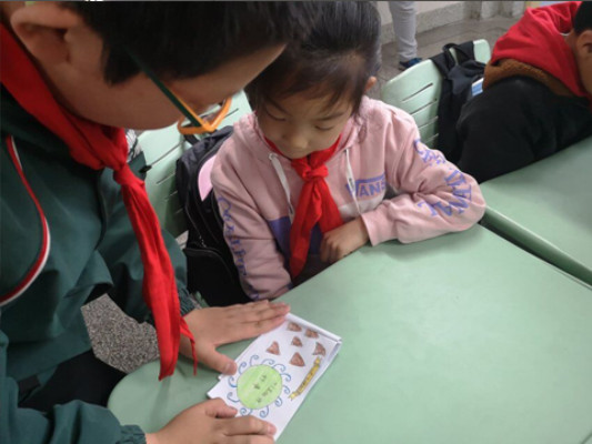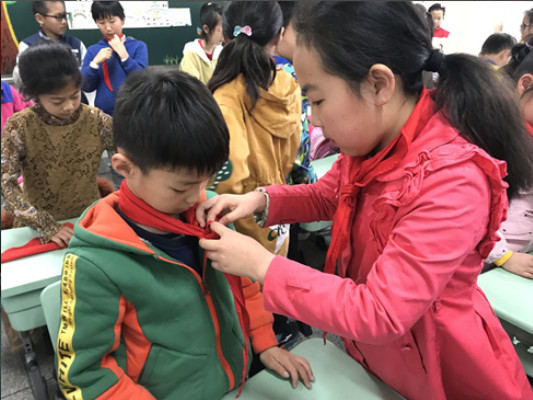 一年级即将迎来神圣的入队礼,5月14日,泰山小学开展了“以队带童,一起成长”的一、五年级大手牵小手,携手向前走的活动。 本次活动以 “我们的旗帜”是红领巾这一主题开始。首先,各班通过PPT讲解队知识让一年级的小朋友们认识鲜艳的少先队队旗、少先队队徽及少先队队员标志等;随后,“小小辅导员”通过小人书的形式让每一位小同学进一步认识到旗帜颜色、图案设计背后的深刻内涵及作为一名少先队员应当肩负的责任等;最后,系红领巾是作为一个少先队员所必备的基本技能之一。 “披在肩上边,左尖压右尖, 右尖绕一圈,圈里抽出尖。”老队员们一边唱着口诀,一边现场演示指导一年级小朋友系红领巾,手指在绕圈、领巾在飞舞,笑容洋溢在每个人的脸上。 系红领巾的礼仪学习,让老队员们在活动中重温了作为一名少先队员的责任与担当,并努力地内化为自己的行动,力争在“以队带童,一起成长”活动中向组织交上满意的答卷。新队员们用自己的努力,展现了一个即将入队的少先队员积极向上的精神风貌,用行动表达着对党和国家、对少先队组织热爱的坚定信念。祝愿低年级同学都能顺利入队,都能在红领巾的指引下,在老队员的引领中,诚实、勇敢、活泼、团结,成为一名优秀的少先队员。