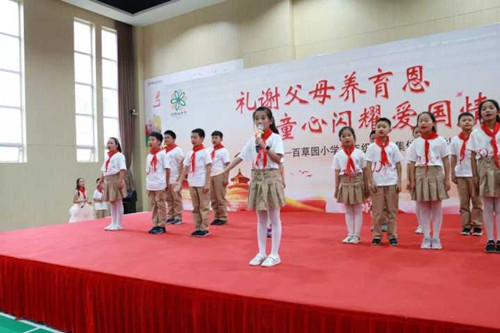 十岁——漫长人生中的一个新的里程碑,意味着孩子即将告别幼稚的童年,迈入令人憧憬的少年时代。为了让少先队员记住这个值得纪念而又充满意义的生日,2019年5月30日下午,百草园小学三年级的少先队员们,在体育馆举行了一场别开生面的“礼谢父母养育恩,童心闪耀爱国情”集体成长礼活动。160多名小寿星和他们亲爱的爸爸妈妈,敬爱的辅导员们欢聚一堂,共同庆祝十岁的生日,分享成长的喜悦与感动。 家长们牵着孩子的手,来到成长拱门前,用丙烯颜料在成长墙上留下手印,纷纷进入体育馆入座。伴随着轻快悦耳的歌声,三1班几位可爱的女生为大家带来了活力四射的韵律舞,拉开了成长礼的序幕,点燃了会场内快乐的气氛。紧接着三4班的少先队员进行了诗朗诵《我长大了》,用动情的语言,传达出成长的自豪与喜悦。孩子的教育是让很多家长头痛的问题,三2班任君皓和巢柯两人则通过相声,表现了家庭教育中让人捧腹的一幕幕,让家长们哈哈大笑的同时,也颇有共鸣。三年级的少先队员们,年纪虽小,才艺可真不少:朗诵、合唱、手语歌、中国舞......整个成长礼,节目精彩纷呈,令家长们啧啧赞叹。他们用自己表演,表达了对父母的感恩、对辅导员的尊敬,更表达了对祖国的热爱。瞧,三3班《大写的中国》的动情吟诵,赞美了祖国伟大的文化和壮美的河山。三年级全体少先队员共同演绎的《中国少年说》,鼓声激昂,气势磅礴,更表达了自己身为少年队国家发展的责任! 活动中,芮校的发言表达了对少先队员们的殷殷期盼和深深嘱托。整个活动中,最感人的莫过于互赠书信的环节。孩子们拆开父母为他们精心准备的神秘礼包,里面可藏着不少好东西:青梅寓意业精于勤;莲子寓意吃苦耐劳;红豆寓意鸿运开来;桂圆寓意人生圆满;芹菜寓意业精于勤。最重要的,里面还藏着父母写给孩子的信。而孩子们早就写好了给父母的信。父母和孩子虽然亲近,但很多话因为中国人含蓄的天性,却从未诉之于口。当这一切通过文字相互表达出来时,不少家长和孩子忍不住热泪盈眶,相拥在一起,场面十分感人,相信这一定会成为他们记忆里,浓墨重彩的一笔! 庄严的成长宣誓结束之后,少先队员们放飞了气球,也放飞了梦想。回到教室之后,又和父母分享了美味的美味的蛋糕,许下了自己的成长心愿。 十岁成长礼的庄严温馨和感人,将深深地印刻在少先队员们的脑海中。相信经过十岁盛典的洗礼,他们一定会对自己的未来更有信心,对自己的人生充满希望!