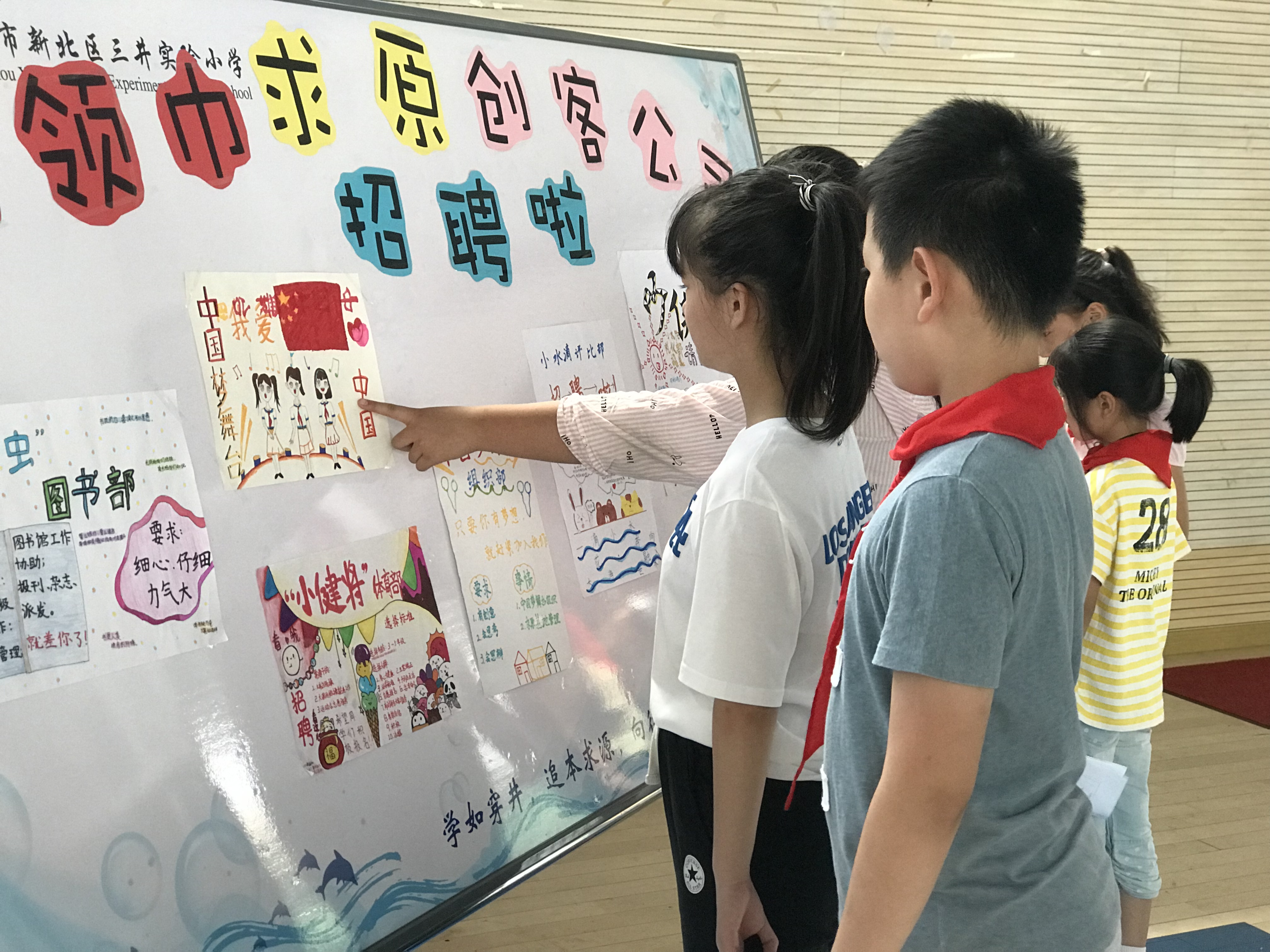 新北区三井实验小学 “红领巾求原创客公司”是一个有爱心、有创造、有梦想、有幸福感的队员自主管理组织。9月19日,红领巾求原创客公司新一轮招新在大家的期待中开始啦!丰富的校级服务岗位,美好的服务愿景,每位队员都跃跃欲试,期待在小岗位上实现大梦想! 活动前,上届红领巾求原创客公司部长团围绕招募工作开展了碰头会,细致地商议招聘细节,绘制了招聘海报。招聘前期的“求原之声”广播宣传会更是让队员们热血沸腾! 红领巾求原创客公司共有七个部门,分别是:“中国梦”组织部、“小太阳”礼仪部、“小水滴”评比部、“小健将”体育部、“绿巨人”环保部、“蒲公英”宣传部、“小书虫”图书部。本次招聘采取“自主报名,择优录取”的原则,全体少先队员几乎都行动起来了,根据自己的性格特点和兴趣爱好,自行选择某一部门积极参与。9月19日12点,队员们带着自己亲手写的岗位竞聘表,排着队伍等候面试,紧张而又充满期待。 在招聘活动中,“小面试官”有模有样,登记信息、提出问题、相应打分。参加面试的队员滔滔不绝地讲着自己对岗位的理解,表达胜任这个岗位的决心,有的队员按照面试官的要求展示“微笑”,进行现场朗诵……少先队员们为了竞聘上心仪的岗位,使出了浑身解数,真可谓是八仙过海——各显神通!后期大队委还将和部门导师商量确定最终入围人选。 让鲜艳的红领巾飘扬,让岗位的力量蓬勃,红领巾求原创客公司全体队员将以实际行动营造文明校园,以饱满精神建设美好家园。