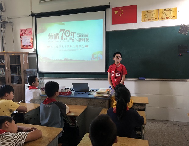 2019年9月29日下午第三节课,校全体师生齐聚各班教室开展了一节以“与国共成长 筑梦新时代”的主题少先队中队活动课程,在各班辅导员老师的带领下,每个班级精心布置,教室窗栏、教室大门等处悬挂小国旗,教室黑板上也书写着与爱国相关的标题,整个校园被营造出了欢庆祖国70华诞的节日气氛。