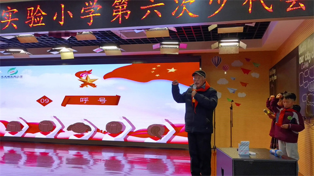 龙虎塘实验小学关工委主任、前大队辅导员、河海老年学校殷明欣校长带队员们呼号。“准备着为共产主义事业而奋斗!”“时刻准备着!”庄严的呼号坚定了队员从小听党话、跟党走的决心。队员们将刻苦学习,树立理想,砥砺品格,增长本领,为了中国梦、强国梦而不懈努力。