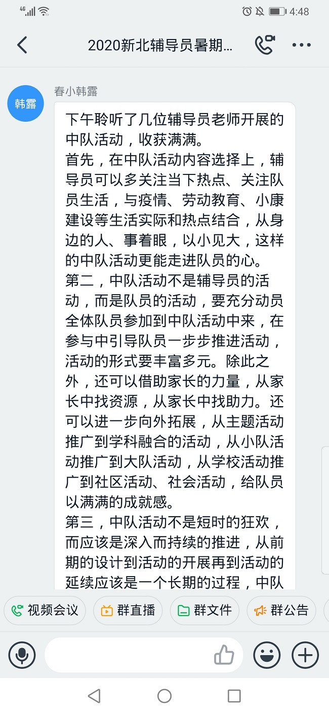 为进一步加强少先队辅导员队伍建设,提升少先队工作科学化水平,新北区少工委以“520”新北少先队辅导员关爱培养工程为统领,于2020年8月20日以网络培训的形式在钉钉群举办2020年新北少先队辅导员培训班。320名大、中队辅导员聚集云端,认真参加了为期一天的培训。 开班仪式 鼓号铿锵,队旗飘扬,嘹亮的队歌声拉开了培训的序幕。新北区少先队总辅导员秦琳同志介绍培训日程安排。团区委副书记、区少工委主任陈俊玮对近几年新北少先队工作取得的成绩表示肯定,并要求参训的辅导员静下心来倾听、参与、感受这样一场培训,跳出工作圈,跳出舒适区,珍惜机会、明确方向、挑战自我,为新北少先队注入新时代的奋斗精神。