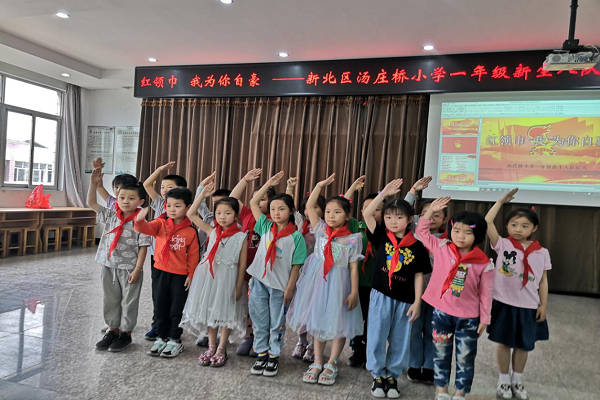 童年的梦,是七彩的梦;童年的歌,是欢乐的歌。在盼望中,一年级的小朋友们迎来了进入小学阶段的第一个儿童节,第一批新队员也迎来了他们入队的日子。 为贯彻落实《共青团中央、教育部、全国少工委关于构建阶梯式成长激励体系增强少先队员光荣感的指导意见》,切实增强少先队员的光荣感和组织归属感,根据区少工委分批入队的工作要求,新北区汤庄桥小学将全面推行分批入队工作,汤庄桥小学少先队大队部结合学校实际制定分批入队评选细则暨"星级学生"评价标准,星级共分为五项:火炬星、礼仪星、智慧星、守纪星、劳动星。获得以上五星的学生可以加入中国少年先锋队。 经过前期“队知识大闯关”,结合同伴评、家长评、教师评等多种形式的评价,最终一年级75名小朋友脱颖而出,成了首批入队的成员。6月1日下午,学校进行入队仪式。新队员们精神抖擞的神态,戴上红领巾时激动的心情,让其余的同学们羡慕不已。在火红的队旗下骄傲地挺起胸、握紧拳,跟着大队长进行庄严的宣誓。大队辅导员卢老师对新老队员提出了殷切希望。最后入队仪式在队员们“时刻准备着”的呼号声中圆满结束。 一场简单而隆重的仪式,激发了全体队员的荣誉感、自豪感和使命感,展示了新时期我校少先队员积极向上的精神风貌。