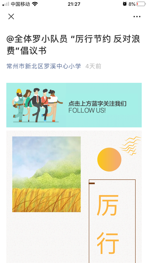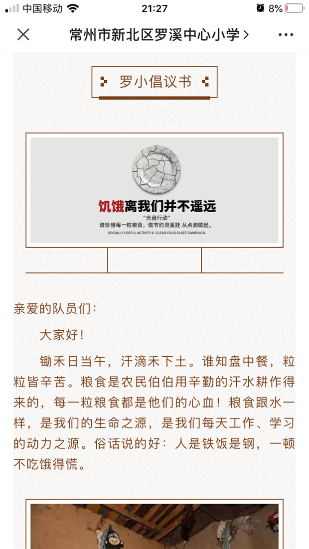 为了把习近平总书记“厉行勤俭节约反对铺张浪费“的重要指示转化为自觉行动,进一步增强师生的文明意识、勤俭节约意识,引导师生养成“珍惜劳动成果,节约资源”的良好行为习惯,促进学生身心健康发展,近日,新北区罗溪中心小学启动了“节约为荣浪费可耻”为主题的活动。 学校少先队大队部通过微信公众号、红领巾广播、宣读倡议书、观看视频《4分钟告诉你,为何要重提粮食节约?》等形式,向全校师生发出“从我做起,从小节约”的倡议。为使活动持之以恒地开展,学校还将采取了多项措施,开展“五个一”系列活动。 开展一次宣讲活动。各中队利用开学第一课、午间美好时光、主题班队会等,以队会、童谣、讲故事、情景剧、诗词朗诵、宣传画、手抄报等形式,大力开展“厉行节约、反对浪费”主题宣讲活动。通过“小手拉大手”,带动家庭和社会参与到爱节约、反浪费的行动中来。 参加一次岗位实践活动。鼓励少先队员积极开展岗位实践活动,培养节约观念。鼓励少先队员买一次菜、做一顿饭,学会量入为出。同时利用学校劳动实践基地积极开展劳动实践活动,亲身体验“一粥一饭,当思来之不易”的深刻道理。 做一次社会小调查。组织少先队员成立假日小队,在辅导员老师的指导下,深入家庭、食堂、饭店等场所,开展剩菜剩饭大调查,亲身了解餐饮浪费的真实情况,撰写调查报告,提出整改建议,向广大市民发出“厉行节约、反对浪费”的科学建议。 组织一次“小小丰收节”主题队会。集中开展一次“丰收不浪费,劳动最光荣”的丰收节主题队会,学习稻田守望者,中国杂交水稻之父袁隆平院士、带领农民致富的赵亚夫爷爷等先锋故事,了解一两种农作物的生长过程,分享一个节约小妙招,制作一张节粮倡议卡,寄给手拉手小伙伴,在队员中营造拒绝浪费的价值导向。 开展一次“节约小达人”争章。围绕“厉行节约、反对浪费”主题教育,结合“红领巾争章”活动,设立“节约小达人”红领巾特色奖章,为在“厉行节约、反对浪费”主题教育活动中表现突出的少先队员颁章,树立人人争当“节约小达人”的新风尚。 通过一系列的活动,勤俭节约理念将深入人心,也将进一步提高了罗小师生的文明素养。罗溪中心小学将一如既往响应习近平总书记的号召,培养学生勤俭节约的美德,让节约为荣的好风气在校园内经久不息。(撰稿:杨继芬摄影:卢庆平审核:殷国伟)