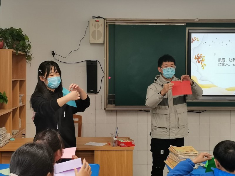 志愿者们还给大家发放材料,指导他们制作贺卡。将制作出来的精美贺卡送给想感谢的人,从小学会感恩,感恩从点滴做起。