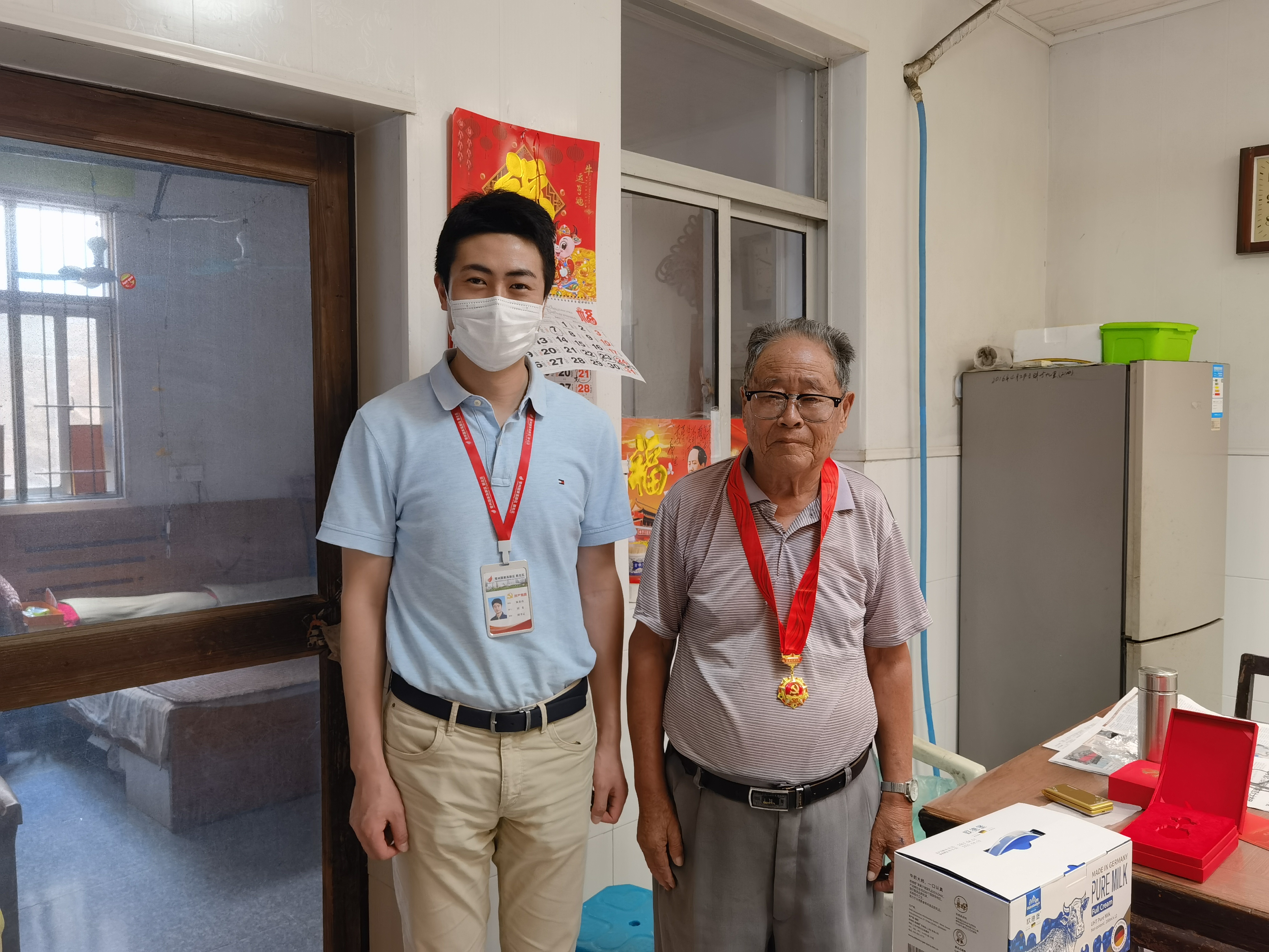 在结对帮扶的薛彪家中,团区委副书记陈俊玮详细地了解他近期的生活情况、身体状况。慰问过程中,薛彪还展示了“光荣在党五十年”纪念章,陈俊玮表示,感谢薛老先生为保家卫国所作出的贡献,同时叮嘱他要多保重身体,有困难会尽力帮助解决,让退伍老兵能够切实感受到党和政府的温暖与关怀。