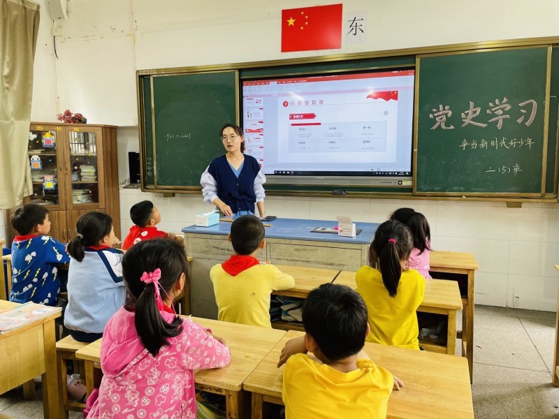 在队课开始之前,班主任们在黑板上写好主题渲染氛围,课中结合PPT,带领同学们认识党旗、了解党史。二5班曹燕老师能结合抗战小故事,以通俗易懂的方式,给孩子们讲解为什么要学习党史。四(1)班陆燕老师通过介绍带领孩子们了解了党走过的艰辛历程,党的优良革命传统,进一步明确了新时代少年肩负的历史使命,听党话、跟党走,做合格的社会主义接班人。