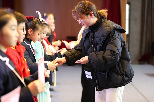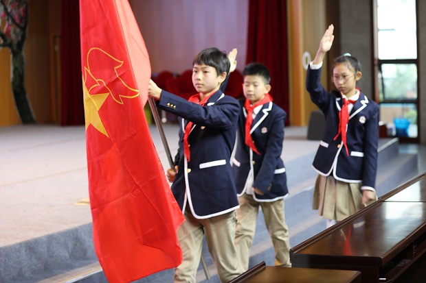 星星火炬下,鲜艳的五星红旗随风飘扬,少先队队歌嘹亮庄严。李小艳校长和刘丹旦主任为大队委候选人颁发了证书并为他们佩戴勇担使命的徽章。