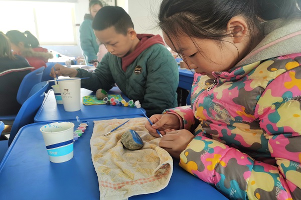 首先,辅导员老师带领大家一起探寻美术的起源,游览世界著名的博物馆,一起探讨绘画技巧。随后,队员们都拿到一枚鹅卵石,他们利用自己的奇思妙想在石头上绘画,完成了一个个独具新意的小小艺术作品。淘气可爱的卡通人物、静谧美妙的乡村夜晚、色彩绚丽的花朵……一块普普通通的石头在孩子们的手中变成了一件件艺术品。这一幅幅生动的石头画不正倒映出孩子们美妙的内心和多彩的生活吗?