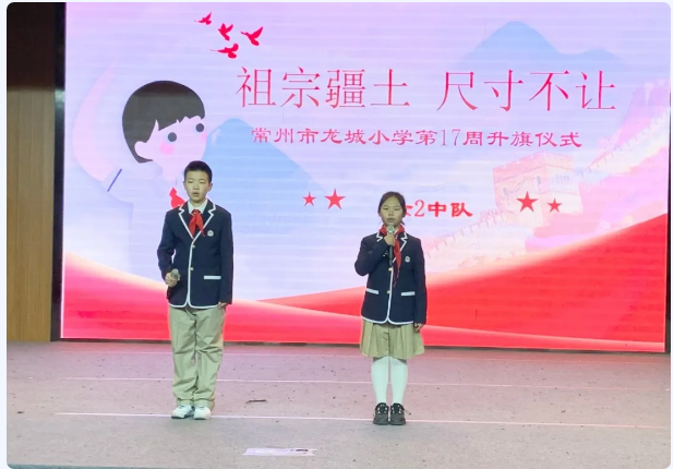 《宋史列传》有云:“祖宗疆土,当以死守,不可以尺寸与人!”几千年的雪雨风霜,中华民族失去过香港、澳门、台湾、九龙、广州湾等地。1999年12月20日,澳门在历尽磨难之后终于回到了祖国母亲的怀抱,昨天正是澳门回归22周年纪念日。常州市龙城小学第17周升旗仪式围绕这一主题展开,六(2)小禾苗中队主持活动。 国歌声中,五星红旗冉冉升起,队员们戴着鲜艳的红领巾,高声唱着《义勇军进行曲》,随着画面的流转,同学们眼前仿佛呈现祖国万里河山。我们的祖国幅员辽阔风光秀丽,万里长城绵延不绝,雄伟故宫端庄磅礴,960万平方公里国土,每一寸都不可分割!随着主持人的介绍,我们了解到中华人民共和国成立以来,通过和平谈判的方式从别国手中收回的土地足足有一万二千平方公里,其中就包括澳门。 在护旗百秒秀环节,六2中队全体队员带来歌曲《七子之歌》《我和我的祖国》。歌曲动人,歌声悠扬,每位队员手中挥动着象征赤子之心的五角星灯,场面感人。 站在世纪的巅峰回首,百年沧桑,我们有许多可歌可泣的故事。本周龙城少年说的演说家是六(2)中队的少先队员汤迈。汤迈同学博闻强识,涉猎广泛,是六(2)中队“行走的百度百科”。这次他给我们带来了吉鸿昌的爱国故事。 正如汤迈所说,“这些革命先烈用他们满腔的热血,冒着敌人的炮火,谱写了无愧于中国,无愧于时代,无愧于人民的《义勇军进行曲》,才使得我们今天的共和国国歌响遍神州,响在世界最高领奖台上,响在世界人民的耳中,并使得那音符越来越高,那旋律越来越强!”——强国有我,请党放心。 美好的校园,是因为有许许多多美好的小龙娃!本周“最美礼仪之星”是六2中队的少先队员刘景周。他是老师的好帮手,同学的好伙伴。每次到午餐时间,都能看到他忙碌的身影,干好自己的分内事之后,还不忘竭诚为班级服务。 刘景周说:“每次我为同学们做一件小事,我都会特别幸福和开心,希望我们的中队在这样的氛围中越来越融洽,越来越好!”是呀,天下难事,必作于易,天下大事,必作于细。每个人都从身边的小事做起,定能让龙城小学的校园,建设得更加美丽! 最后值日校长经雏月为全校小龙娃作出值日点评,希望少先队员们每日常规越来越棒,健康快乐成长。