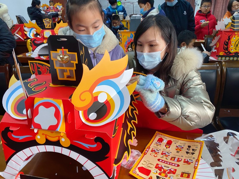 在九洲培训中心妇女微家中,孩子们铺起红纸,蘸着墨汁,一笔一划将虎年的美好期许跃然纸上,笔尖上陈久弥香的年味也油然而生。盘龙社区妇联还邀请了辖区内书法爱好者陈兴妹、杨彪两位老人现场书写对联、绘画创作,80岁高龄的陈老太太写起书法来好生了得,多种字体的“福”字各显神韵,看着一幅幅寓意吉祥的春联跃然纸上,孩子们不禁发出声声赞叹,羡慕不已。 醒狮文化在中国历史上源远流长,不仅寓意着如意吉祥,更是勇敢和力量的象征。在腾龙社区二楼活动现场,孩子们积极发言,共同讨论春节的起源、民间风俗、各地美食等相关内容。在志愿者声情并茂地讲述关于“年”的故事中,孩子们被深深地吸引。在志愿者和家长的协助下,亲子家庭共同制作醒狮,孩子们彼此学习、相互展示、录制各种方言的新春祝福语。