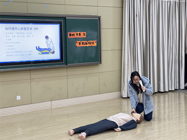 冬日暖阳,香槟湖小学二(2)跳跳堂中队的徐辅导员邀请虞皓兰妈妈为队员们带来了一节有趣的科普课程《身边的急救技术——心肺复苏》,此次课程我们还邀请到了同年级四个兄弟班级一起在一楼报告厅认真聆听。