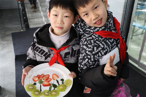 假期里队员们寻访不停,常州小导游招聘活动如火如荼地开展,高年级队员化身小考官,小朋友分别围绕嬉戏谷、紫荆公园、迪诺水镇、青果巷等八大景点进行应聘,才艺表演、景点介绍……短短的几分钟,各位应聘者或幽默风趣,或热情活泼,或自信大方,充分地展现了自己小导游的风采。 什么是美味星球?香槟湖的混融式学习成果博览会为你揭开神秘面纱。食堂里不时传出一阵阵清脆的欢笑声,苹果、香蕉、火龙果、芒果等水果散发着阵阵清香,小组合作下内容丰富、五彩缤纷的水果拼盘映入眼帘,欣欣向“融”、蜜瓜冰墩墩、栩栩如生的小鸟……再配上一首首诗词名句,队员们从创作中得到美的启蒙,受到美的熏陶。