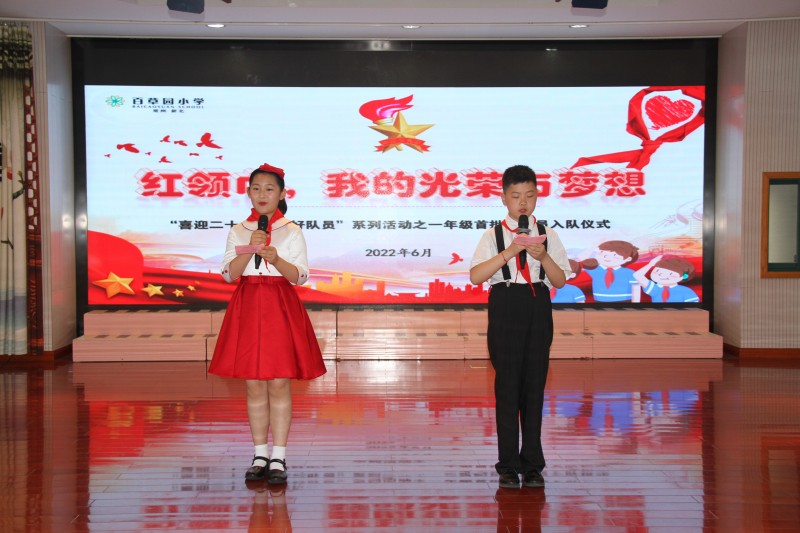 星星火炬引方向,队旗飘扬心向党。为迎接党的二十大胜利召开,传承好“党是先锋队、团是突击队、少先队是预备队”的红色血脉,响应全国少工委分批入队的文件精神,6月2日下午,百草园小学在四楼报告厅隆重举行“红领巾,我的光荣与梦想”——“喜迎二十大 争做好队员”系列活动之一年级首批新队员入队仪式。