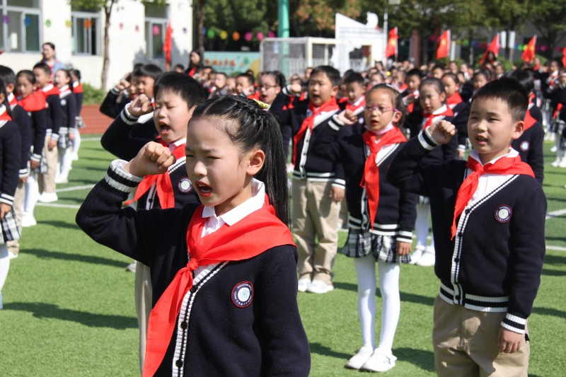 二年级的少先队员、预备队员和中队辅导员早早地来到操场,两位第一批已入队的小主持人也做好了准备,入队仪式在十点整正式开始。仪式以少先队员代表带来的歌舞表演《红领巾心向党》开场。伴随着节奏鲜明、庄严有序的出旗曲,精神抖擞的旗手手擎少先队队旗走了过来,全体队员、辅导员敬队礼,预备队员敬注目礼,仪式正式拉开了帷幕。 少先队大队辅导员陈楚阳宣读入队队员名单。在《红领巾飘起来》的音乐声中,五年级的少先队员代表给新队员们系上鲜艳的红领巾,2021级第二批队员们正式加入中国少年先锋队,光荣地成为了少先队组织的一员。红领巾是红色基因的延续,是少先队员胸前的荣耀,是少先队员心中崇高的信仰。全体少先队员唱起了《中国少年先锋队队歌》,嘹亮的歌声响彻校园上空。在大队委陈雨珂的带领下,新队员在队旗下庄严宣誓。新队员代表们也做了精心的准备,带来了诗歌朗诵《红领巾》,以此表达他们激动的心情和争做新时代好队员的决心。