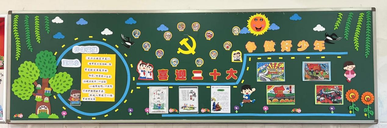 学习二十大 队员有话说。请党放心,强国有我!通过学习二十大,少先队员在心中种下了红色的种子,队员们欢欣鼓舞、反响热烈,慷慨激昂、意气风发的话语饱含了对党和祖国的深切热爱。在这接力百年奋斗的新征程中,立足于百年新起点,作为新时代少先队员的我们应从百年党史中汲取智慧和力量,努力学习,不断进步,为共产主义事业而奋斗!——四1班杨溱。 我们作为少先队员,生在春风里,长在红旗下,感恩这个新时代,感恩伟大的共产党,感恩祖国的繁荣与富强。喜迎二十大,初心不渝,砥砺前行!领航新时代,续写华美乐章!——四3班宋锦天。 丹青妙笔绘盛景,坚定不移跟党走。学习二十大,队员们激情满怀,信心百倍。他们精心制作了手抄报、黑板报、书法等作品,用七彩的画笔,放飞梦想,祝福盛会圆满成功,送上对新时代最深情的礼赞。