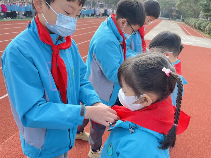 星星火炬,代代相传,今天,少先队组织又迎来了一批新伙伴,周海娣副校长宣读了组建一年级少先队组织的决定,并宣布新队员名单。五年级的优秀少先队员代表为每一位新队员授戴红领巾,新队员的脸上洋溢着自豪与光荣的笑容。