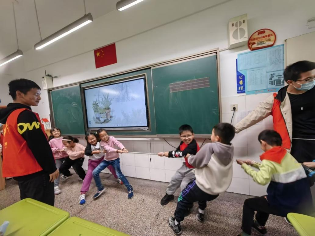 科技是第一生产力,人才是第一资源,创新是第一动力,为了在孩子心中根植科技的种子。12月10日下午,河海大学信息学部物联网工程学院2022级自动化二班走进河海实验小学三4班讲解有关摩擦力的科学知识。 活动伊始,主持人提问同学们对摩擦力的有关认识。同学们积极参与,踊跃发言。有的同学说摩擦力就是一种让东西停下来的力,有的同学说摩擦力就是两个物品互相挤压产生的力。在揭晓答案前,主持人带领同学们观看了有关摩擦力的小视频。通过视频,同学们认识到摩擦力就是一种两个粗糙的表面相互挤压而形成的阻碍物体前进的力。 接着,为了让同学们体会到摩擦力,主持人带领同学们进行拔河小游戏。共进行三轮,每轮点五位男生五位女生,两条队伍队尾分别有两位志愿者保护同学们的安全。拔河时热闹非凡!欢呼声加油声汇成欢乐的海洋。
