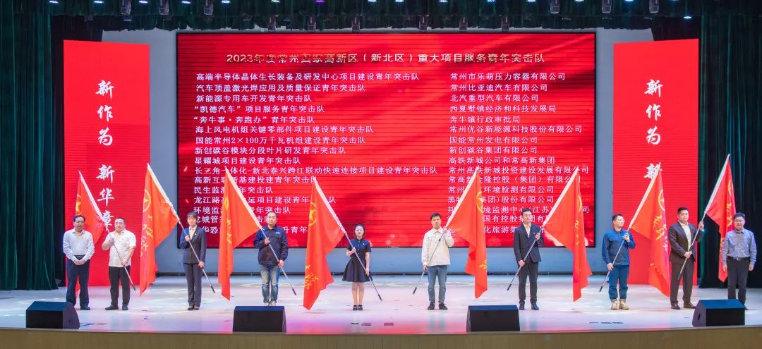 常州工学院党委副书记王传金、常州团市委副书记汪舟为2023年度全区重大项目服务青年突击队授旗。