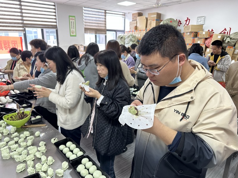 在几位糕点厨师的现场教学下,大家纷纷开始揉面、裹馅、包团、上屉……有些还做出了别出心裁的造型,在现场的蒸的第一屉青团上,专门印上了代表着罗溪镇群团特色品牌的“溪星·家”字样。
