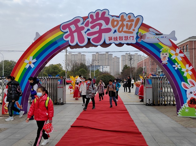 “国风迎新”仪式感满满。笋娃服务社的队员们身着汉服,头戴生肖帽,扮成可爱的小兔子,早早迎接全体队员的到来! “吉物祈福”幸福感足足。辅导员老师们还为队员准备了满满的祝福:大鼓、苹果、橘子、火龙果、葱,祝愿队员们在新学期平平安安、红红火火、聪明伶俐、一鼓作气……队员们忍不住看了又看,摸了又摸,带着微笑与祝福,穿过智慧门。