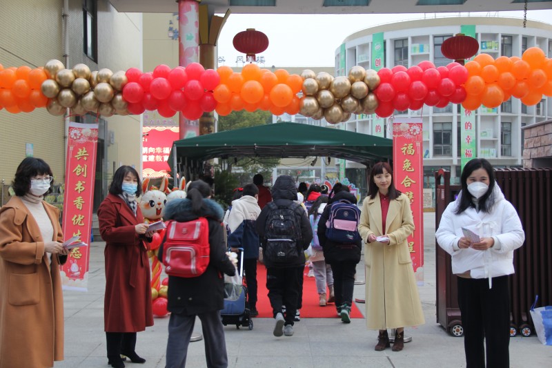 迎接他们的是书香浓郁的开学氛围。学校结合2023全国教育大会上提出的“把读书作为大事来抓”,将“书香校园”建设融入新学期,开启诗意教育新征程。 玲珑、盘龙两个校区同步迎新,一本打开的“大书”和学校自创的“六福兔”兔年吉祥物,正在校门口迎接着龙娃虎妞们!只见龙娃虎妞们或是手提着兔儿灯,或是头戴着兔儿头饰,有了“福兔”的加持,他们个个精神抖擞。校长、老师们在缤纷的气球门前,微笑着递过“书香祝福卡”,亲切地送上兔年祝福,热情地欢迎他们的回归。书香祝福卡一侧印有“书香校园建设金点子征集卡”,向全校龙娃虎妞征集书香智慧,共建书香校园。