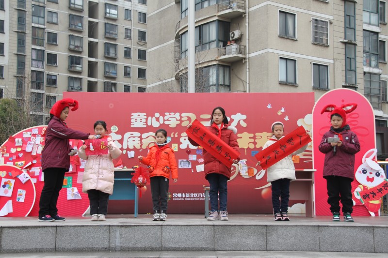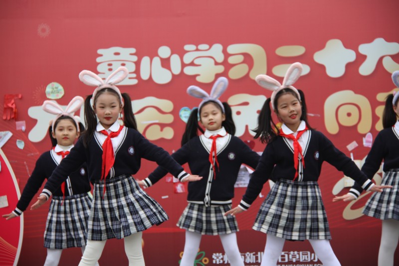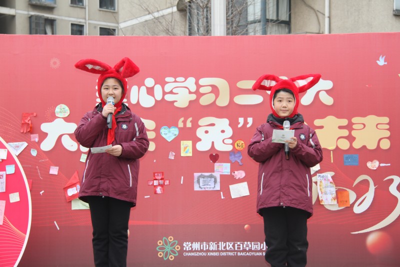 红色精神是中国共产党永不落伍的坚定信仰,五4中队的马智瑾分享了她观看电影《满江红》的心得体会,并带领全体队员齐诵千古名篇《满江红》,充沛的情感、雄浑的声音,无不体现了百草娃将家国情怀的红色精神代代相传的坚定决心。在中国传统生肖文化中,兔子活泼机灵,是活力和幸福的象征,二年级和三年级的队员代表头戴兔子头饰以萌萌的《兔子舞》带领全体少先队员唱唱跳跳迎接快乐的新学期。