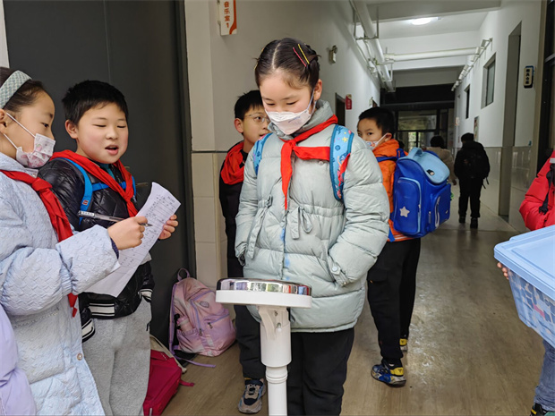 “太阳当空照,花儿对我笑,小鸟说……”轻松快乐的儿歌唱出了美好心情。可是为什么有些队员步履轻松,精神抖擞,有些队员却背脊弯弯,脚步迟缓。原来是背上的小书包各有乾坤,书包里到底装了什么呢?是什么压弯了背,拖住了脚?辅导员老师和我们的护脊小卫士们趁着早晨入校、放学离校时间在走廊给队员和书包称重呢!