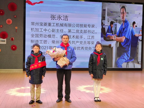 全体新桥二小的辅导员老师和少先队员们先通过一段视频了解了劳模张永洁,视频讲述了张永洁由一名普通技校生,成长为在数控切削加工领域的高级技师、全国劳动模范、江苏制造工匠的先进事迹,队员们被劳模叔叔那务实创新、精益求精的匠人匠心深深触动。