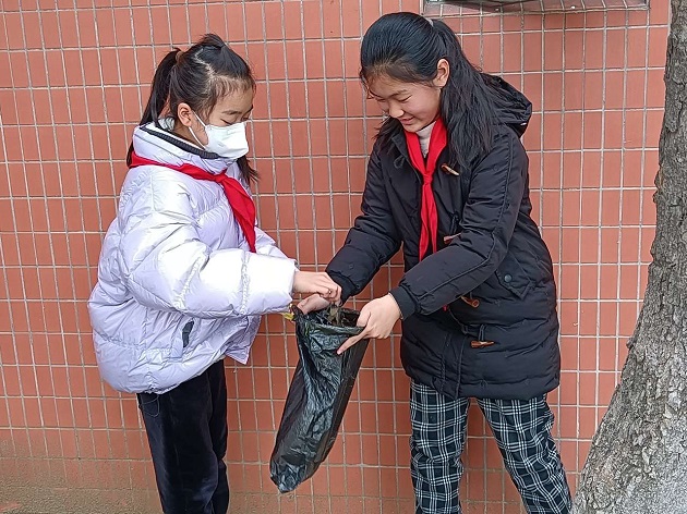 五年级的队员们戴上手套、领着环保垃圾袋,走进校园的角角落落。大到废纸盒,小到一个纸片,队员们仔细地捡起每一片垃圾,不放过任何一个角落,让校园更加干净整洁。