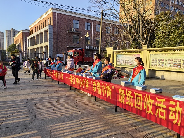 小小薄纸寄深情,废纸捐献我先行。周五一早,队员们陆陆续续走进校门进行捐废纸活动。队员们将一包包废纸交到工作人员的手中,个个脸上洋溢着喜悦的笑容。不一会儿,满满的一卡车纸,凝聚着春小“红领巾”的环保力量,队员们用双手绵延绿色的希望。