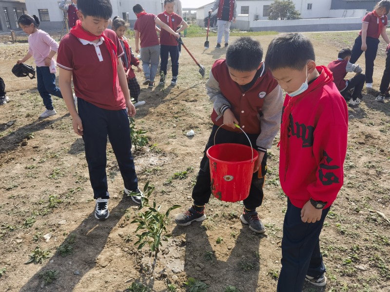 一番热火朝天的劳动过后,一棵棵新栽的树苗精神抖擞,在和煦的春风中展现勃勃的生机,不正像这些努力学习新知识的少先队员吗?接下来队员们沿着树根的周围给小树苗浇水,小树就栽好了。浇下的是甘泉,也是汗水,埋下的是树苗,也是保护绿色的愿望,更是造福未来的希望。