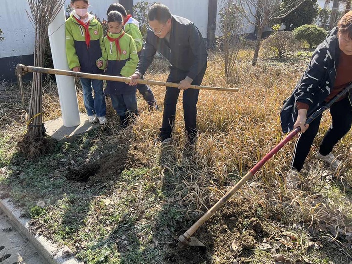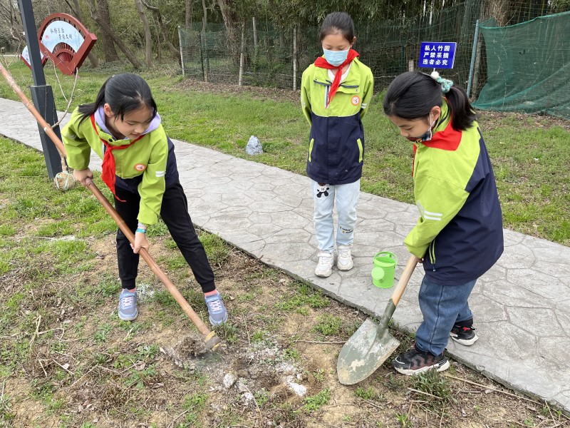 活动前期,各中队辅导员老师利用午会、班队课时间,讲解植树节的由来,介绍了植树的作用和价值,让队员建立起守护树木、保护自然的朴素情感。学校种植社团的辅导老师更是向队员们分享了种植树木的步骤与要求,激发了大家植树造林的热情。3月10日下午,四年级的少先队员代表来到学校田径场的最南边的绿化带,种起了树。队员们两两配合,男队员肩扛铁锹,女队员手拎水桶,在大家的通力合作下,二十几棵小树苗便毅然耸立在沃土之上。队员们激动地与小树苗进行了合影,大家希望小树苗快快长大,让这片生机成为校园最靓的风景线。