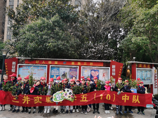 为激发孩子们爱绿、护绿、亲绿的情感,践行“绿水青山就是金山银山”的理念,3月12日上午,三井实验小学五(10)中队的队员们早早地来到三井社区党群服务中心门口,赴一场春天的约会。大家自备铁锹、水桶,在工作人员的引导下,穿上志愿者的服装,领取自己的小树苗。 一棵树、一抔土、一把肥料,队员们人小力气有限,但植树的干劲却是一点儿也不小,在家长志愿者和工作人员的帮助下,挖坑、栽植、覆土、浇水、定根,大家通力将小树苗稳稳地植入泥土,并在树上蜀上姓名和心愿,一起茁壮成长。
