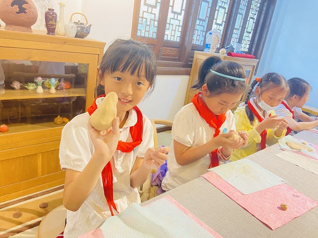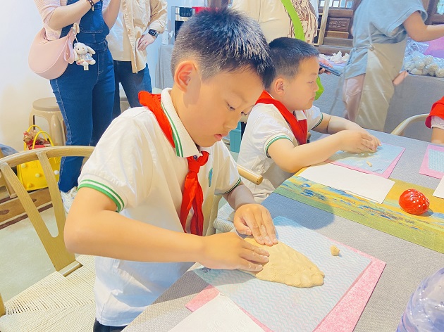 一块平淡无奇的泥团经过揉搓、上釉、烤制就能变成一个个栩栩如生的艺术品,队员们都迫不及待想要亲自上手操作。随后,队员们在泥人馆老师的指导下,拿着泥块也有模有样地揉、压、搓、捏……