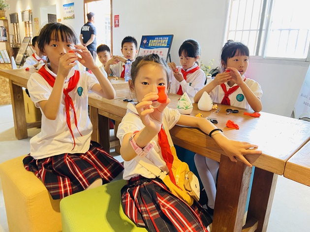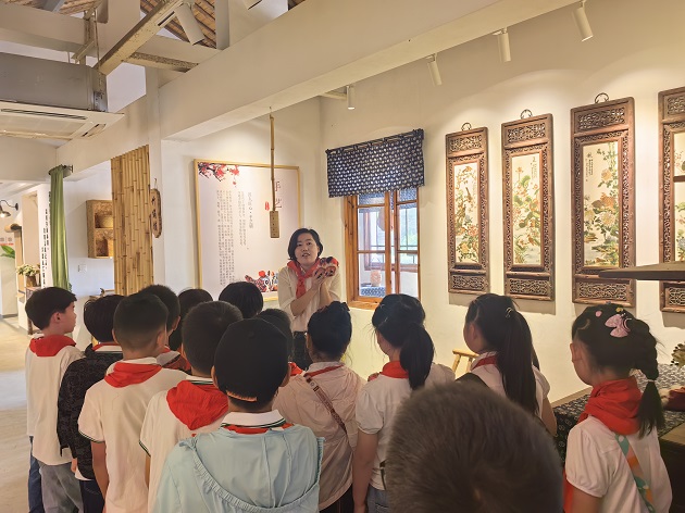 跟随讲解员的脚步,队员们来到了一派江南风貌的“梅林匠心铺”。据说五匠工艺传承特色的“匠心铺”是梅林村一大亮点,梅林村委将当地一些乡村史迹、传统工艺等资源整合,设计出一个以传承匠人匠心精神为主题的传统文化展示基地。张记铁匠铺、王嫂剪纸铺、薛氏风筝铺、孔家木匠铺、老李竹编铺,这一个个有趣的店铺名勾起了队员们的好奇心,里面那一个个古朴的传统工具、精美的传统工艺都吸引着队员们的目光。
